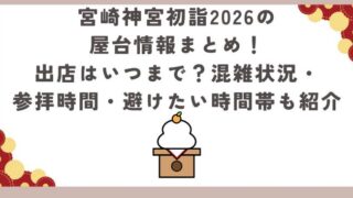 宮崎神宮の初詣2026の屋台(露店)情報を総まとめ。出店期間はいつまで?屋台の場所・営業時間の目安、混雑ピークと避けたい時間帯、参拝時間の注意点まで分かりやすく解説。
