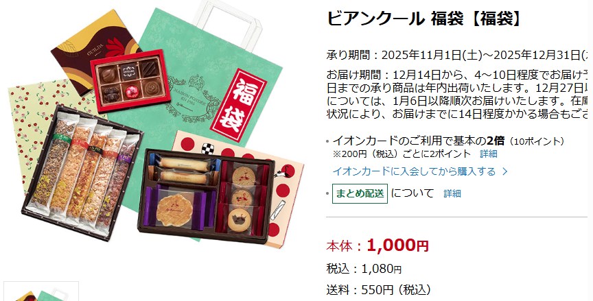 - イオンショップで「ビアンクール 福袋」を検索 → 商品ページから数量選択・決済。受付期間中に注文すれば、12月中旬以降に順次配送。
