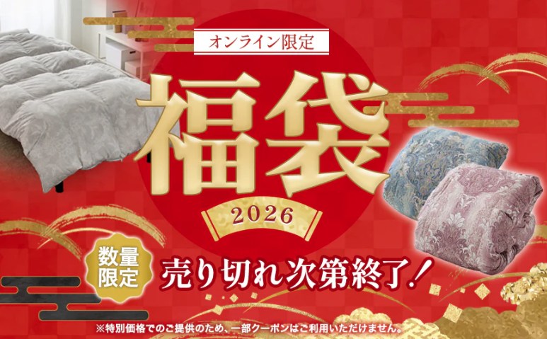 • 羽毛掛け布団・敷布団・毛布などの福袋が数量限定で販売。