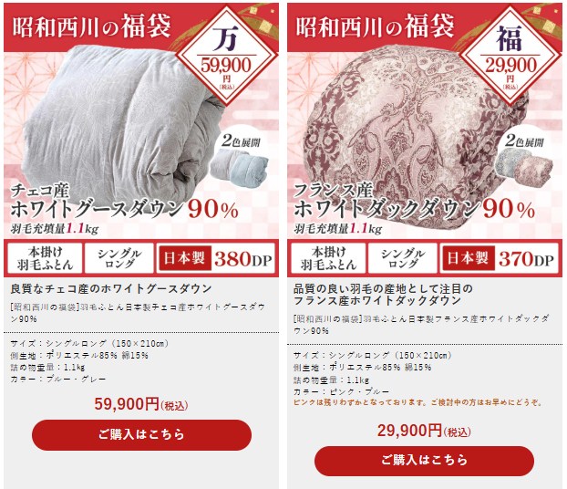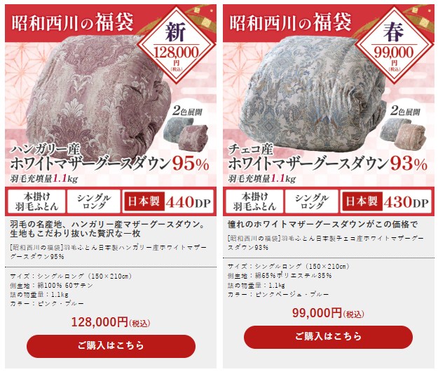 • 昭和西川 福袋2026:ハンガリー産マザーグースダウン95%(約128,000円)など