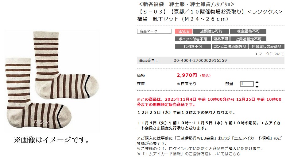 → 例:阪急メンズ大阪「カジュアルソックス5足セット 2026福袋(約4,070円)」 - 店舗で受け取れる場合もあり、「実店舗+オンライン」の二段構えが可能