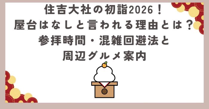 この記事では、住吉大社の初詣2026で屋台が“なし”と言われる理由、参拝(開閉門)時間、混雑ピークと回避法、代替グルメ「汐かけ横丁」+周辺の食事案までをまとめます。
